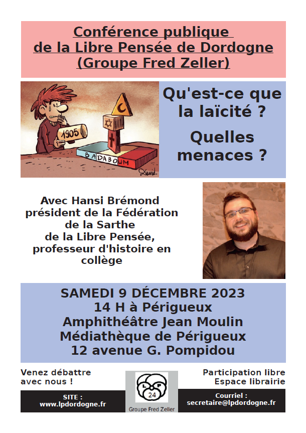 Les Libres penseurs de Dordogne du Groupe Fred Zeller organisent une conférence publique sur la laïcité samedi 9 décembre à 14H à l’amphithéâtre Jean Moulin de la médiathèque de Périgueux.